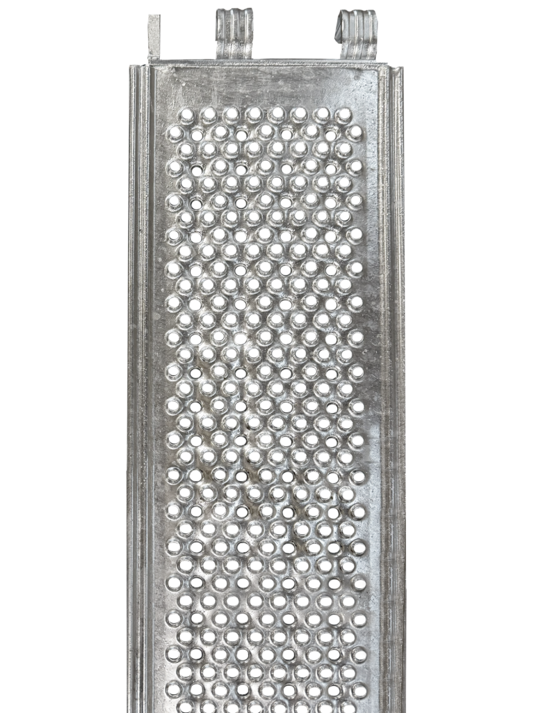 • Revêtement en tôle d’épaisseur 1,5mm, avec profil ouvert de hauteur 76mm.La surface de marche est équipée de trous ø12mm en relief avec effet antidérapant.