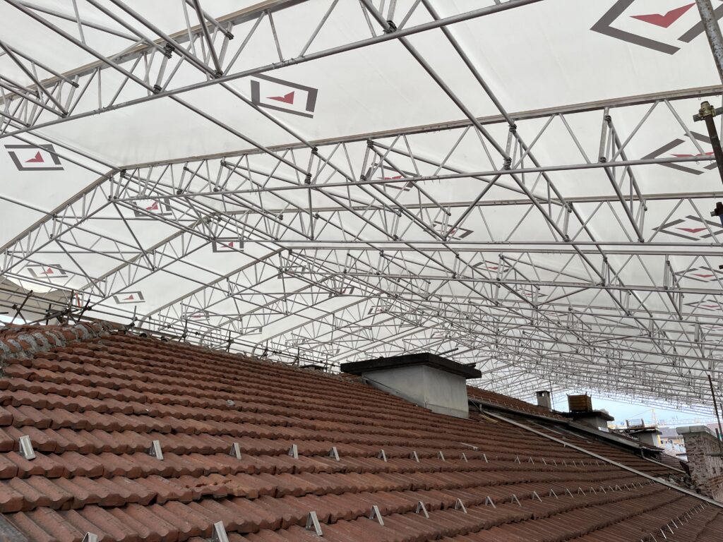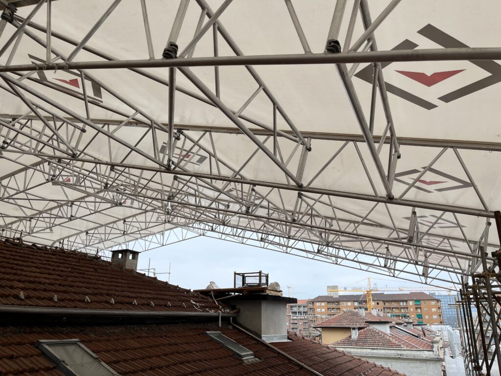 La modularité du système permet la construction d’une travée allant jusqu’à 24 mètres de long. Ce système de recouvrement léger et fonctionnel permet de gagner beaucoup de temps de montage. ROOFTOP peut être fixé sur tout type d’échafaudage ou de tour d’etaiement.